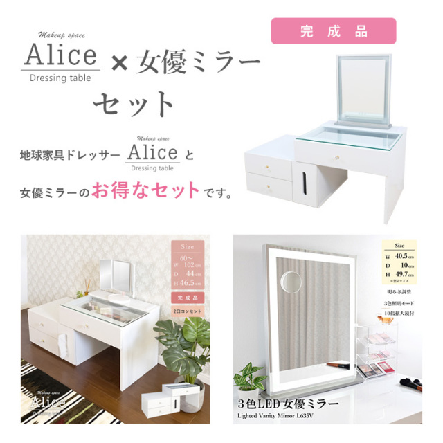 ドレッサーAlice 伸縮タイプ 引き出し4杯 完成品 2口コンセント 幅60cm~102cm×奥行44cm×高さ46.5cm