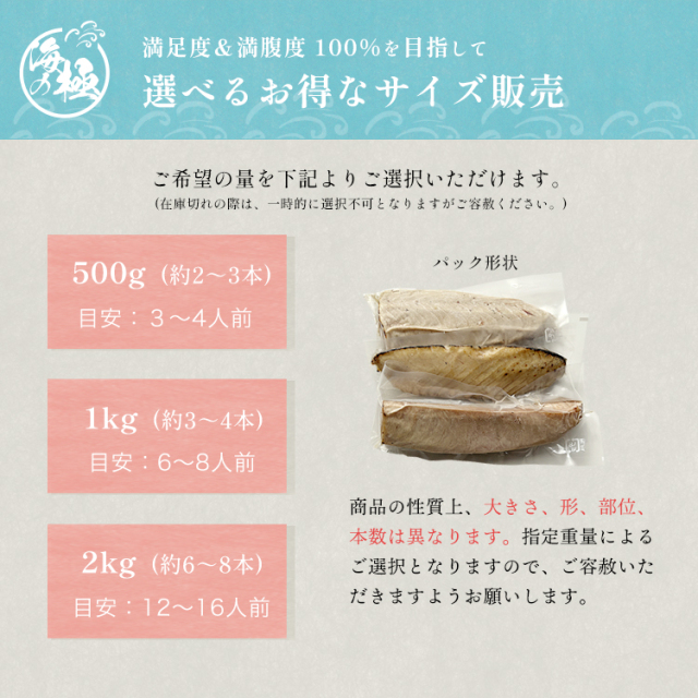 びんちょう炙りたたき 500g、1kg、2kgからお選びいただけます。 500g,・・約2~3本, 目安3~4人前 1kg,・・約3~4本, 目安6~8人前 2kg,・・約6~8本, 目安12~16人前 |