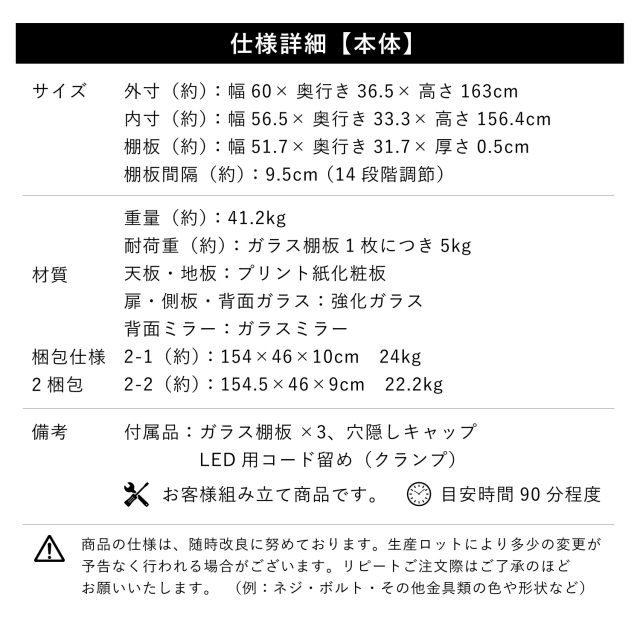 ・付属品:ガラス棚板×3、穴隠しキャップ、LED用コード留め(クランプ)