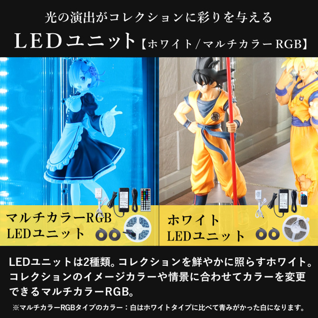 ガラスコレクションケースJONY ワイドハイタイプ(幅80cm)、ガラスコレクションケースMISTA ミドルハイタイプ(幅60cm)専用のマルチカラーRGB LEDユニットとなります。