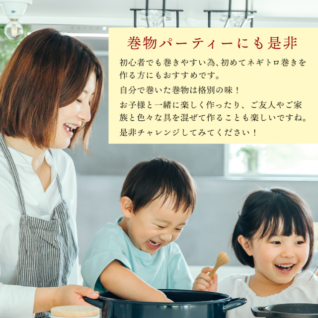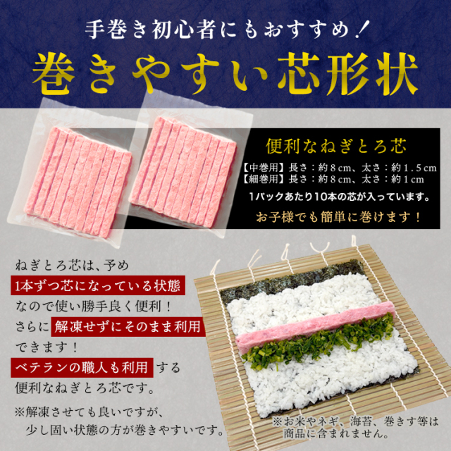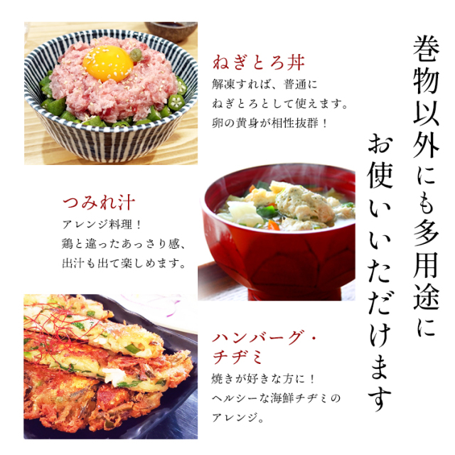 | お召し上がり方 | 商品は芯形状のため、解凍しやすい状態になっておりますので、冷凍庫から出してそのまま巻物にお使いいただけます。少し凍っているくらいが巻きやすいです。また、巻物以外でも解凍されれば普通にネギトロとしてネギトロ丼等にもお使いいただけます。 |