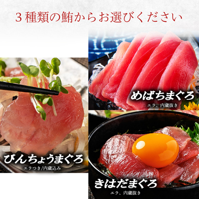 | 原材料 | まぐろをご選択いただき、カートに入れてお買い求めください。 ビンチョウマグロ(エラ付き、内蔵込み) キハダマグロ(エラ、内蔵抜き) メバチマグロ(エラ、内蔵抜き) |