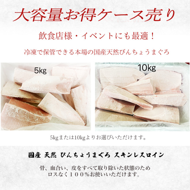 | 鮮度抜群の国産天然びんちょうまぐろを、使いやすいスキンレスロインでお届け。皮なしで調理が簡単、刺身や寿司、丼ぶりに最適です。業務用サイズの5kg、10kgから選択できて、飲食店やイベントにおすすめ。急速冷凍で旨みを閉じ込めています。 |
