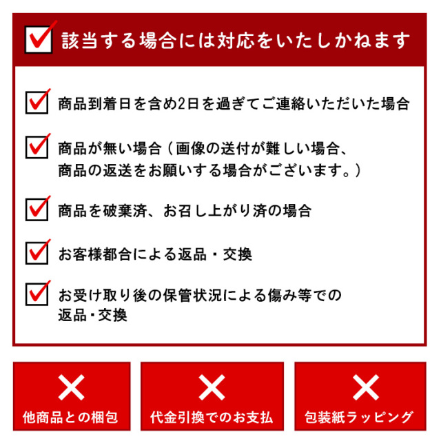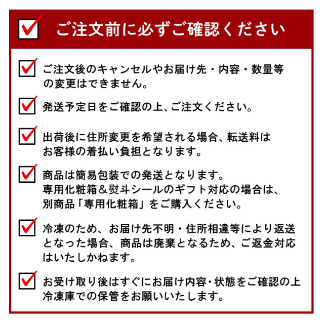 ※商品は冷凍状態で発送いたします。 ※納品書は同封しておりません。 ※ご注文後のキャンセルやお届け先・内容・数量等のご変更はできません。 ※出荷後に住所変更をご希望される場合の転送料はお客様の着払い負担となります。 ※生鮮食品のため、お届け先不明・住所相違等により返送の場合、商品は廃棄となるためご返金対応はいたしかねます。 ※商品をお受け取り後はすぐにお届け内容・状態をご確認の上、冷凍庫での保管をお願いいたします。 ※万が一、お届け商品に不備があった場合は商品到着後2日以内に商品画像と共にご連絡ください。 ※商品の色や質感は撮影時の光加減やモニタ画面により異なります。 |