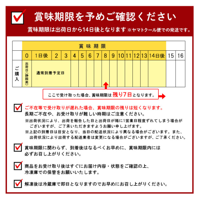 発送日から冷凍で14日、解凍後は当日中 ※解凍後はすぐにお召し上がりください。 ※家庭用冷凍庫の場合、業務用冷凍庫に比べ保存温度が高いため品質が損なわれる可能性がございます。お早めにお召し上がり下さい。 |