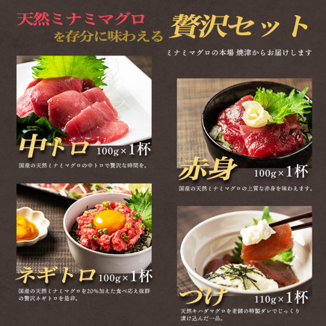 4種のミナミマグロを中心としたセットでマグロを一度に楽しめる豪華な“マグロづくし”セットです。