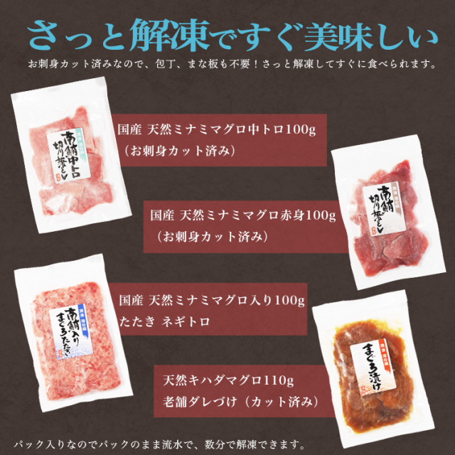 | 原材料・内容量 | ※下記4種類のパックで1セットになります。ご購入の際は1セットか2セットをお選びいただき、お買い求めください。 ・南鮪切落し(中トロ)100g:南鮪、食用植物油脂/トレハロース、pH調整剤、酸化防止剤(V.C) ・南鮪切落し(赤身)100g:南鮪(天然)、食用植物油脂/pH調整剤、酸化防止剤(V.C) ・南鮪入りまぐろたたき100g:目鉢鮪、南鮪(天然、鮪中に20%配合)、袖長鮪、食用植物油脂、食用精製加工油脂/pH調整剤、トレハロース、酸化防止剤(V.C) ・黄肌鮪漬110g:キハダマグロ、しょうゆ、砂糖、水飴、みりん、酵母エキス、かつお節エキス/pH調整剤、酸化防止剤(V.C)、(一部に小麦・大豆を含む) |