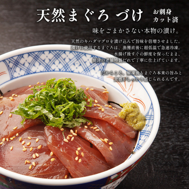 商品は冷凍状態でお届けしますので、解凍後、そのまま刺身やマグロ丼等でお召し上がりいただけます。 【お召し上がり方】ボウル等の容器を用意し、パックのまま容器に入れてください、水を細く流し、5分から10分置いてください。※パックはできるだけ全体を水につけておくとムラなく解凍されます。 |