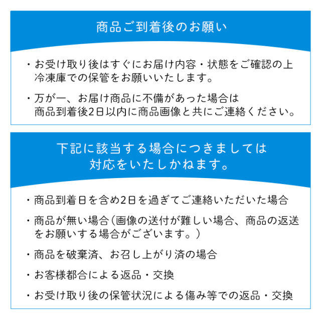 ■ご注文確定前に必ずご確認ください ・ご注文後のキャンセルやお届け先・内容・数量等の変更はできません。 ・お届け先・受取日をご確認の上、ご注文ください。 ・出荷後に住所変更を希望される場合、転送料はお客様の着払い負担となります。 ・商品は専用ボックスでの発送となります。包装紙でのラッピングには対応しておりません。 ・冷凍のため、お届け先不明・住所相違等により返送となった場合、商品は廃棄となるため、ご返金対応はいたしかねます。 ■商品ご到着後のお願い ・お受け取り後はすぐにお届け内容・状態をご確認の上、冷凍庫での保管をお願いいたします。 ・万が一、お届け商品に不備があった場合は商品到着後2日以内に商品画像と共にご連絡ください。 ■商品は冷凍状態で発送いたします ・配達後のお持ち歩きには対応しておりません。 ・お届け後は必ずすぐに冷凍庫へお入れください。 ・受け取り不可の場合、再送はいたしかねます。 ・保冷材は入っておりません。 ※納品書は同封しておりません。 ※商品の色や質感は撮影時の光加減やモニタ画面により異なります。 ※同商品に内容量違いの商品があるためお間違いにご注意ください。 |